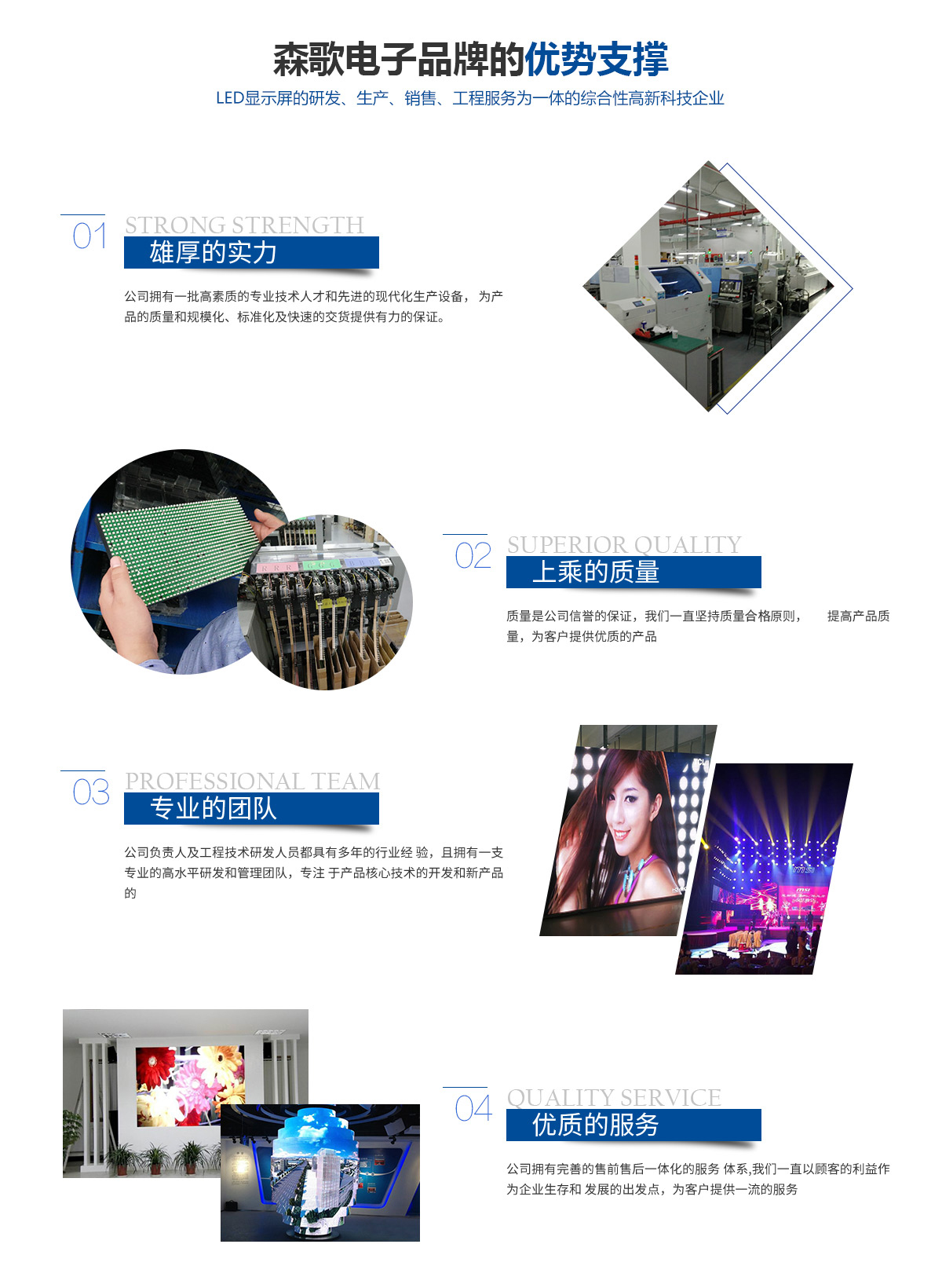 鄭州森歌電子科技有限公司是一家專業從事LED顯示屏的生產、銷售、工程服務為一體的高新科技企業。公司擁有一批高素質的專業技術人才和先進的現代化生產設備,公司的主要負責人及工程技術研發人員都具有15年以上的LED行業經驗,擁有一支專業的高水平研發和管理團隊,專注于LED核心技術的開發和LED新產品的自主創新,為產品的質量和規?;?、標準化及快速的交貨提供有力的保證。公司在福建、深圳建立了生產基地。 鄭州森歌電子科技堅持以方案完善,質量過硬,服務及時為口號,堅持走高品質路線。現我公司工程業績已遍布省內外,并且在政府機構、軍事指揮、銀行系統、醫療教育、室內外廣告、酒店會所、公安指揮調度、水利工程、視頻會議等多個行業領域得到廣泛應用并獲得客戶的一致好評和普遍認可,是客戶值得信賴的長期戰略合作伙伴。